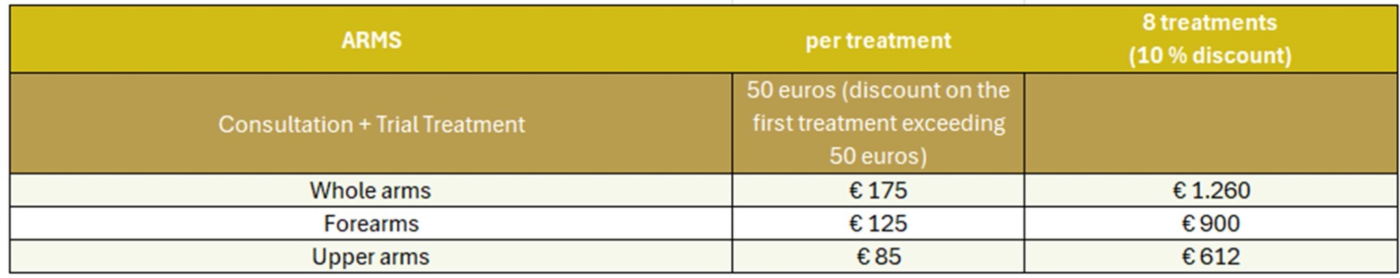 The price depends on the area to be treated (lower arms or entire arms) and the number of sessions required. In most cases, 6 to 8 sessions are sufficient for a lasting effect. Here are the prices per treatment